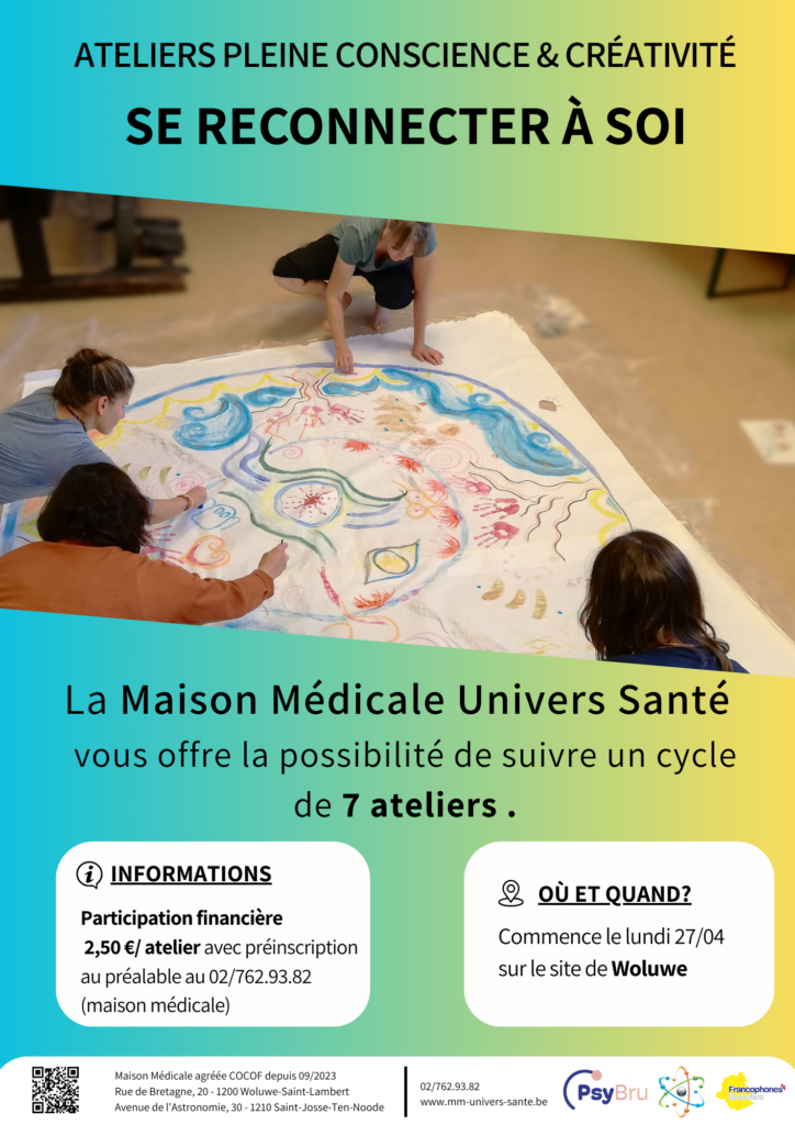 Cet atelier propose une approche qui associe pleine conscience et expression créative afin de favoriser la détente, l’exploration des émotions et le bien-être.